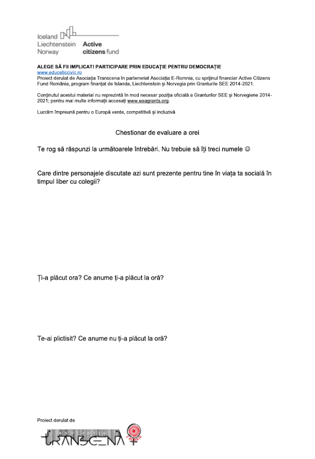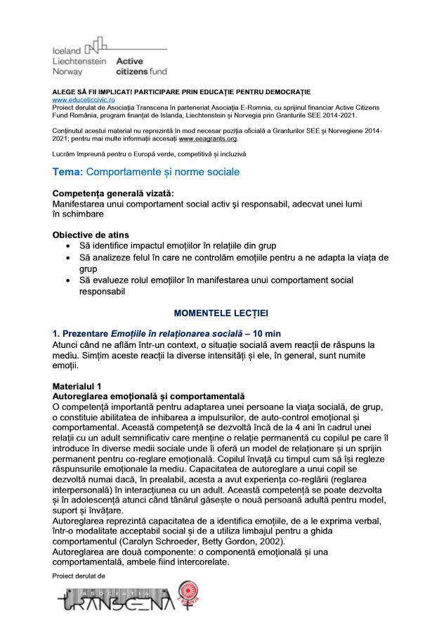 În această lecție competența generală vizată este Manifestarea unui comportament social activ şi responsabil, adecvat unei lumi în schimbare. Obiectivele sunt identificarea, rolul și controlul emoțiilor în manifestarea unui comportament social responsabil.