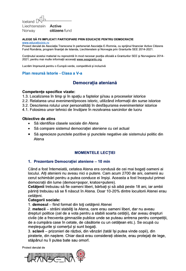 Obiectivele lecției sunt identificarea claselor sociale din Atena, compararea sistemului democrației ateniene cu cel actual și aprecierea punctelor pozitive și negative ale sistemului politic atenian.