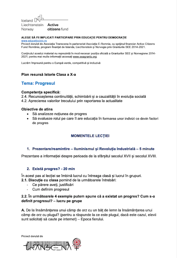Obiectivele lecției sunt analiza noțiunii de progres și evaluarea rolului pe care îl are educația în formarea unor indivizi ce devin factori de progres.